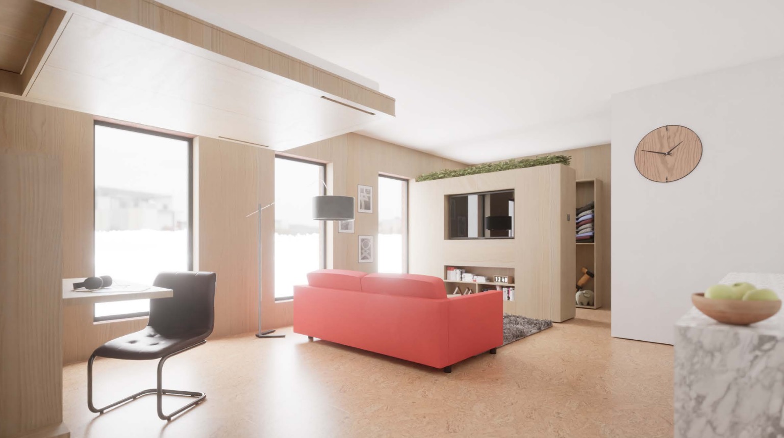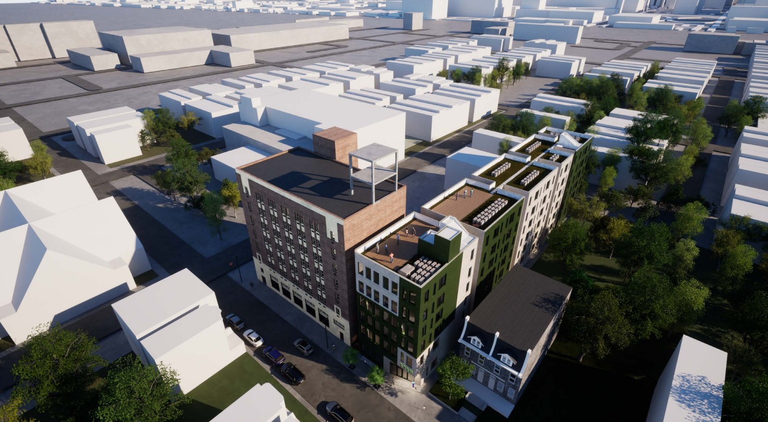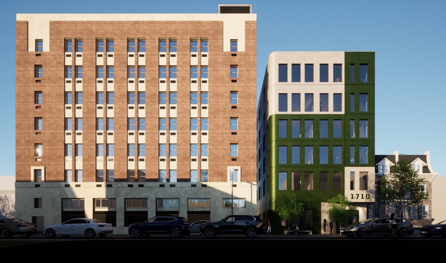 The design from Oombra Architects is not what we would have expected here. The building utilizes bright green and white brick for the entirety of its facade, with the window scale and placement mimicking the tower next door (which sits very close to said windows). The rounded front corner adds a playfulness to what could otherwise be a heavy design, and a large roof deck will offer up views of Center City – even if the rendered skyline is a bit out of date. The units will also utilize a space-saving system to mitigate some of the impact of their small dimensions, which will be in the 400-500 sqft range.