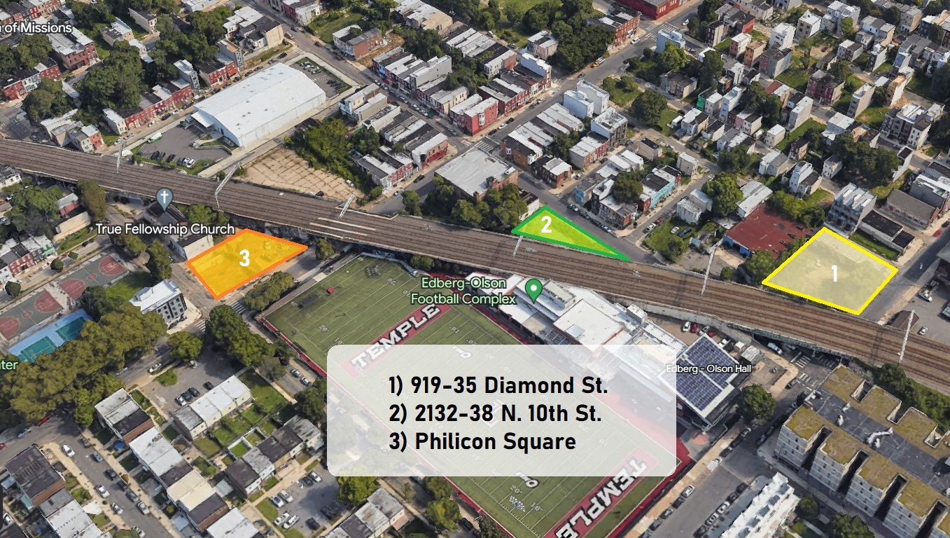 The area around Temple‘s campus isn’t necessarily the most beautiful part of the city. With an unfortunate number of empty lots and decrepit buildings, the line between the shiny campus and the grittier surroundings can be quite stark. Thanks to a recent demo permit (more on that in a minute), we find ourselves near the intersection of 10th & Diamond, where three properties that weren’t bringing much to the table are in the process of getting major upgrades. Let’s make like an owl and get a bird’s eye view of the area.