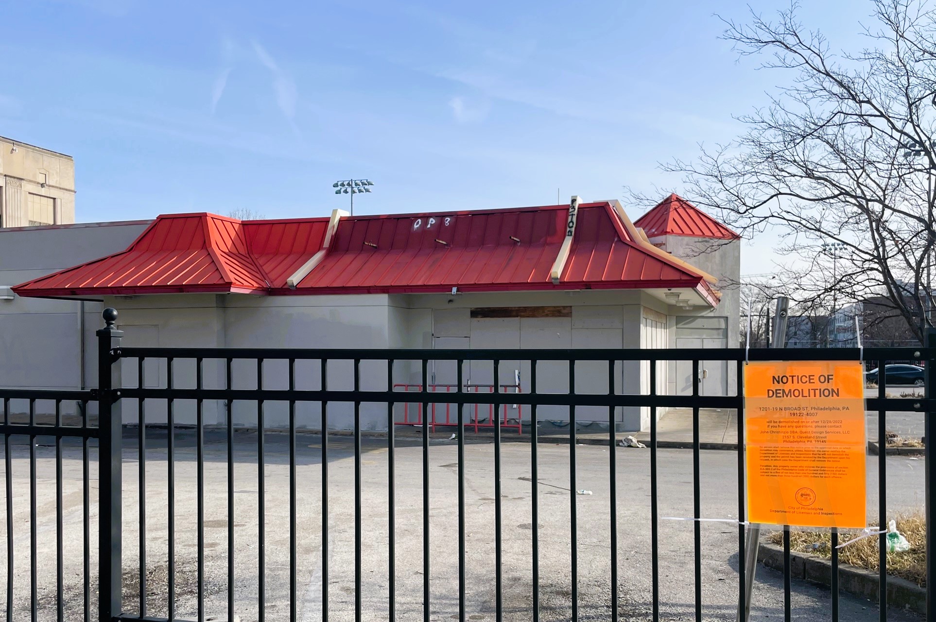 The Broad & Girard intersection is one of the major crossroads in the city, and not just because two wide roads happen to meet at this location. Featuring both the Girard Ave. stop on the Broad Street Line as well as the returning-in-September Route 15 trolley line stop, you might envision a grand intersection with towering buildings. That’s not so much the case, with a shuttered fast-food restaurant on the northeast corner representing perhaps the worst of the four corners here. This locally famous McDonald’s closed several months back, and we were excited when we saw a demolition notice on-site while heading across town. Per the permit issued earlier this month, the structure could come down any day.