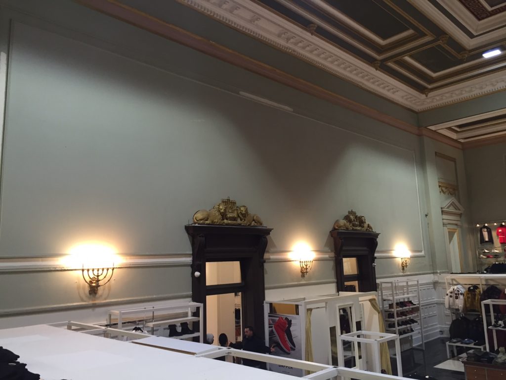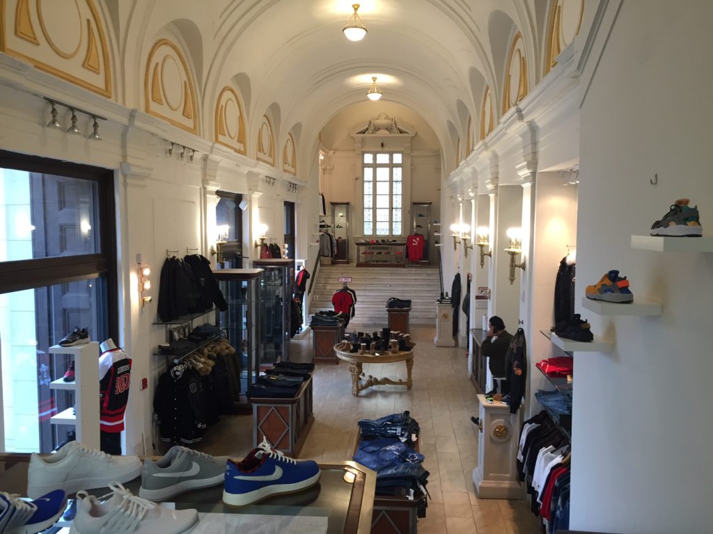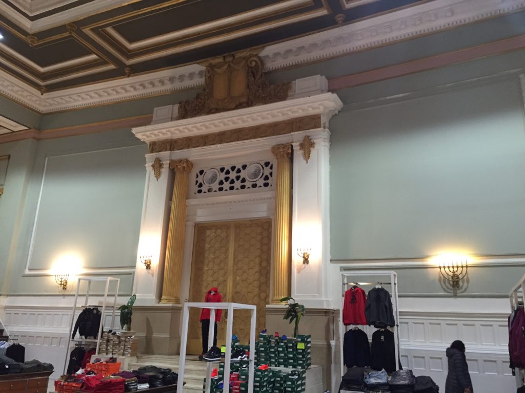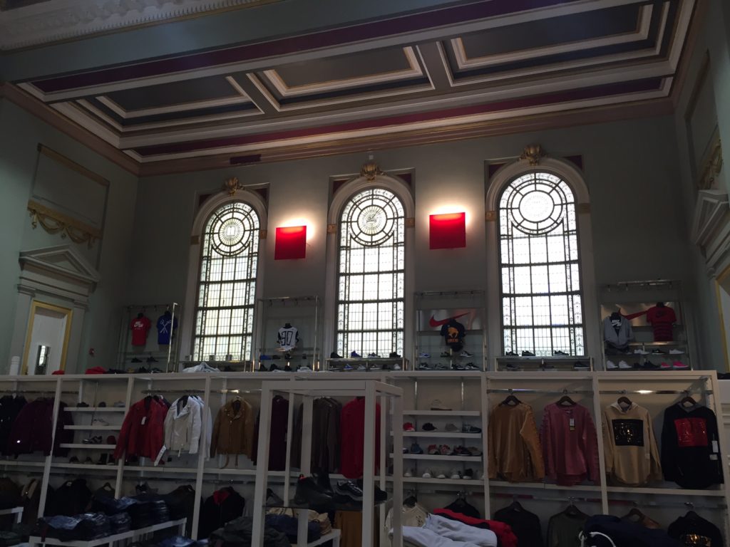It turns out, the folks that bought the building decided to either open a retail store in the building or have leased it out as such. Official Unlimited is a retail store with another location in Willow Grove that sells clothing items from various brands. At their address on North Broad Street, they've taken advantage of the amazing interior of the building to present their wares. The building is divided into two separate rooms, with a small space in the front which we imagine was once a lobby, and a larger space in the back which we have to believe was the sanctuary. Check it out: