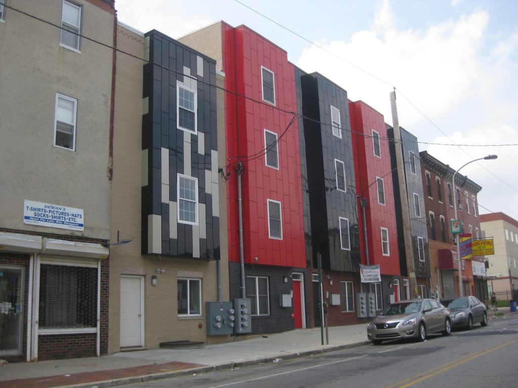 October was our last visit to the 1700 block of Cecil B. Moore Avenue, when two new buildings were finished up and a few more were on the way. At the time, we remarked on the inclusion of "commercial space," as required by the zoning code, but speculated that based on the design the developers never intended for businesses to open but instead would eventually convert those spaces to apartments. We still think that seems likely.