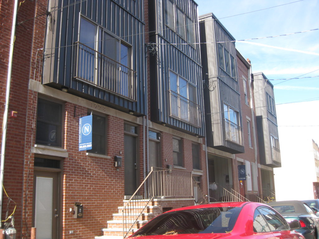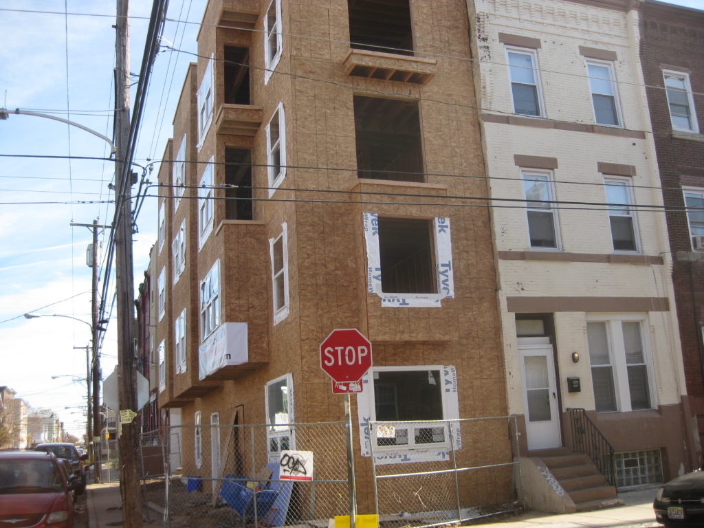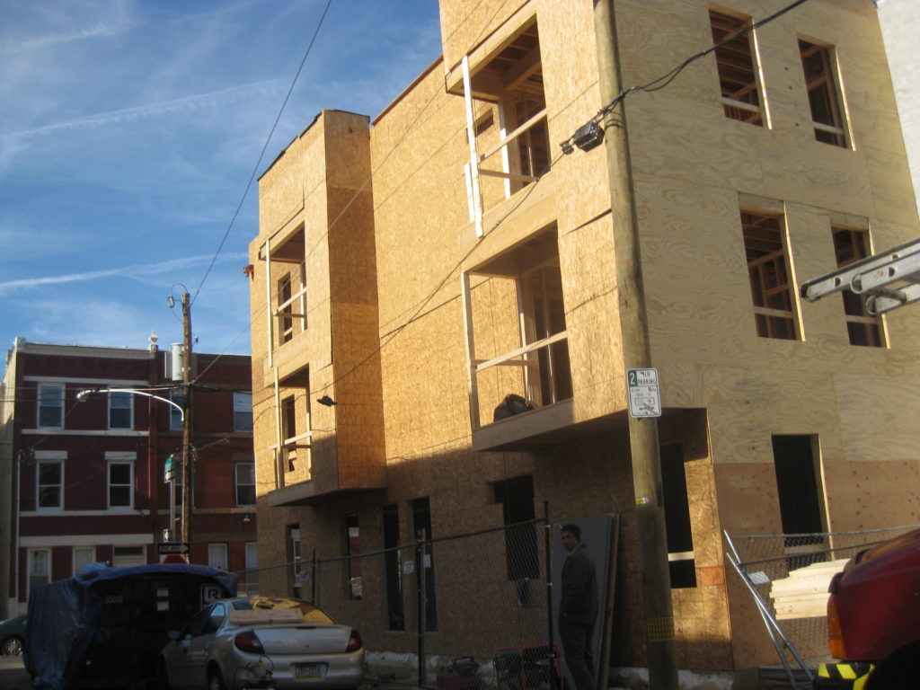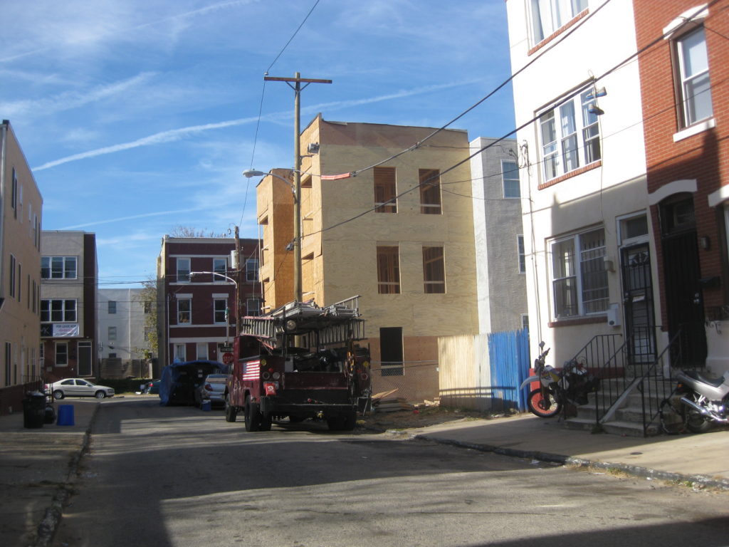 Last week, we told you about a new hole we spotted near 17th & Diamond that will soon turn into new student rentals near Temple. Today we have some other projects to tell you about nearby, buildings which we would also wager will eventually contain Temple students. First, we look at the northeast corner of 18th & Monument, where a new quadplex has been framed out. Across the street on 18th are a bunch of buildings that have gone up in recent years.