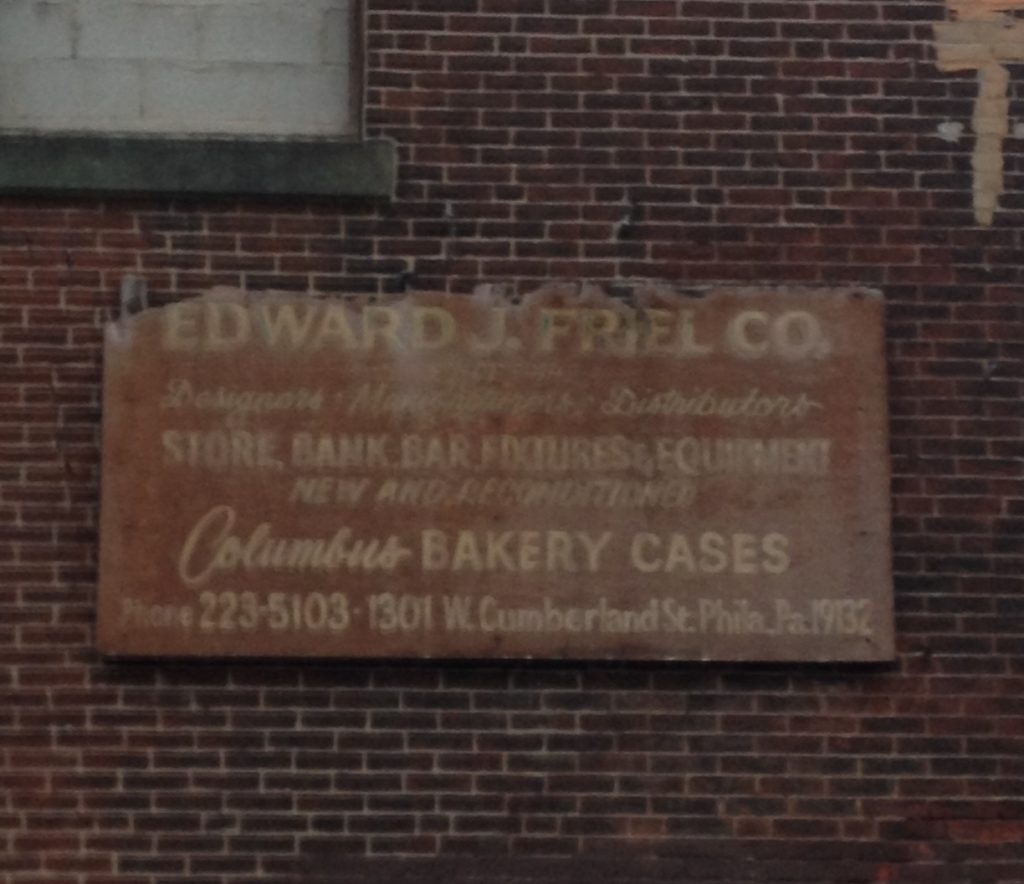 Across the street, at 1301 W. Cumberland St., is an old factory. We can tell you that in 1922 it was the Fine Art Lace Co. (thank you Google!), and that more recently, it was home to the Edward J. Friel Co. “Designers, Manufacturers, and Distributors: Store, Bank, Bar Fixtures & Equipment: New and Reconditioned”, and by a company making “Columbus Bakery Cases” (thank you old signs!).