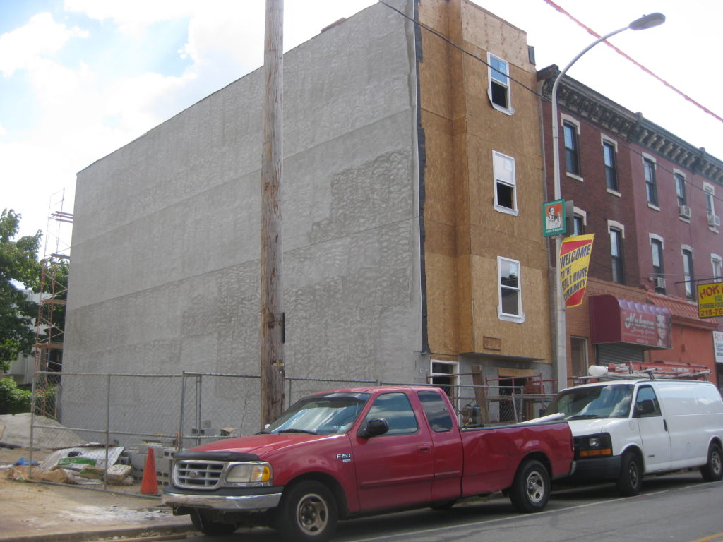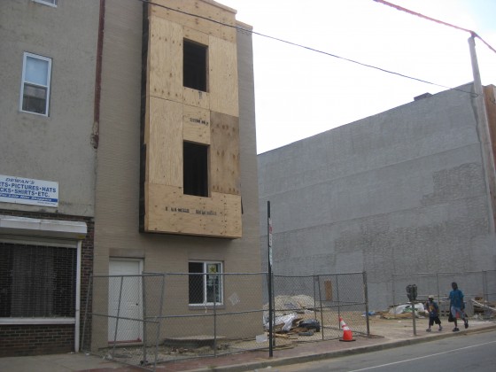 In the foreground of the photo above is 1704 Cecil B Moore Ave., a former convenience store. Willington Equities LLC purchased the property earlier this year, demolished it, and is building a new structure with three apartments and a vacant commercial space on the first floor. Looking at the building, we’re a little unclear on how they’ll rent out the commercial space…