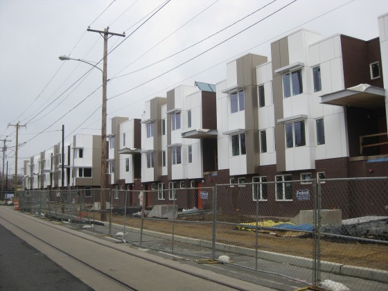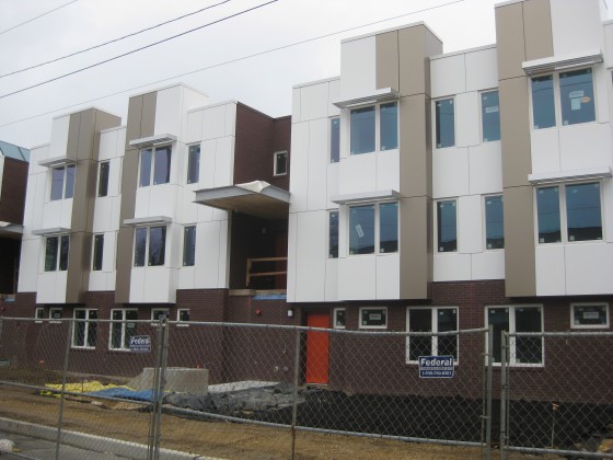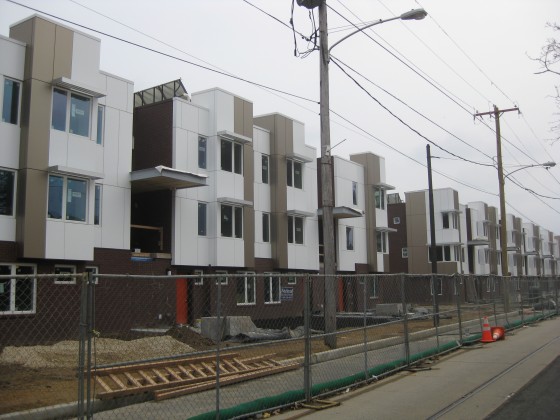 We were in the neighborhood the other day, and the exteriors of these homes look like they’re very nearly done. No clue how things look inside the homes, but the outsides looks awfully close to the renderings.