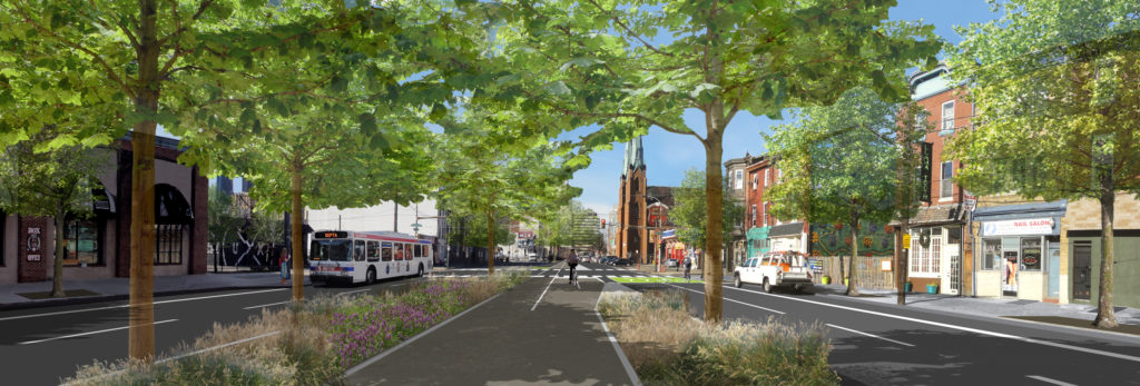 Studies that PEC did over a few years of research centered around connecting the Delaware River trails to the those of the Schuylkill and resulted in the creation of the Spruce/Pine bike lanes. Another result of their research was the selection of Spring Garden Street as a candidate to become a greenway, a strip of road protected from motor traffic, through America’s fifth largest city. Right now, PEC is working on propelling the concept from feasibility to funding, around $30M worth. Its designs are informed from ideas generated from community meetings and modeled and inspired by existing greenways like the Hudson River Greenway in Manhattan. They presented the idea to the Spring Garden Civic Association this June.