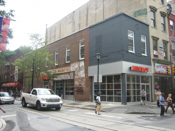 Not only has Milkboy significantly improved the building it occupies, but it will hopefully provide new energy to this somewhat depressed section of Chestnut St. In either direction, you see, almost exclusively, either low-end retail or vacancy. Their corner is just a block below Market St. and an entrance to the Convention Center, very close to Thomas Jefferson Hospital, and only steps away from a bustling block of Walnut St.; one would expect far better retail options around it. Hopefully, the opening of Milkboy is one of the first steps in what will be a long process of rehabilitating this disappointing stretch. And hopefully the Carpenter’s Union will throw away the inflatable rat.