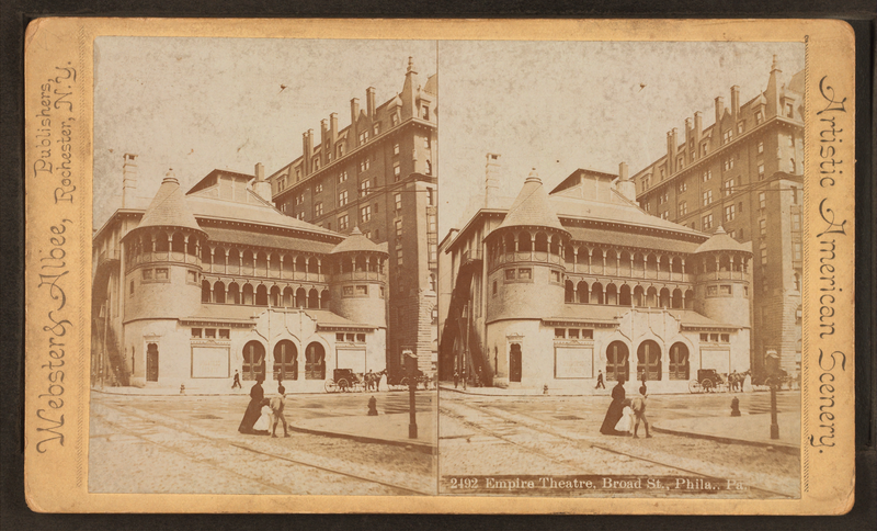 According to Wikipedia, Adam’s Express was one of the first and largest shipping concerns in the United States prior to the Civil War. In fact, Adams used its strong positioning in the South to distribute anti-slavery newspapers below the Mason-Dixon line. And in 1849, escaped Virginia slave Henry ‘Box’ Brown used Adams Express to ship himself to Philadelphia freedom. Following the Civil War, Adams increasingly turned its attention toward corporate investment, leaving the Broad Street location to serve as a privately owned warehouse for the next several decades. Then, according to Irvin Glazer’s Philadelphia Theaters: A Pictorial Architectural History from the Collection of The Athenaeum of Philadelphia, the Empire Theatre opened on this spot in 1891. The theatre is shown here below in a photo taken from the Robert N. Dennis collection of stereoscopic views.