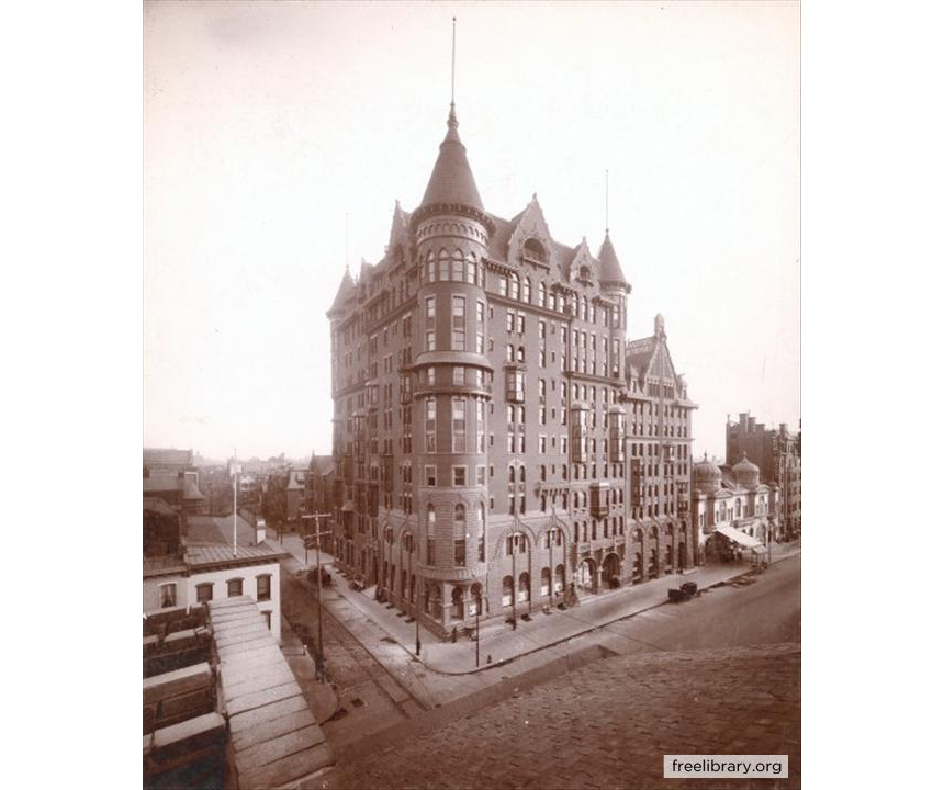 According to Glazer, the lovely Queen Anne style theatre only existed for seven years. Glazer reports that “the site was too valuable for a theatre and it was replaced by the large Walton Hotel in 1898. The arches, turret effects and spires similar to the Empire theatre were reproduced with the building of the Walton Hotel.” Said hotel is pictured below in an image taken from the Historical Photo collection maintained by the Free Library of Philadelphia.