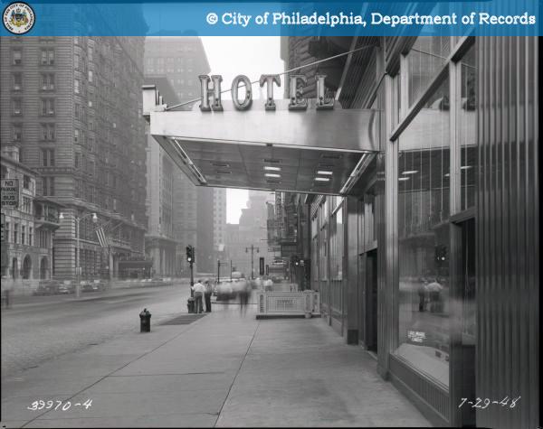 The Walton Hotel, alternately known as the Hotel Walton, merged the Empire Theatre with the neighboring Hotel Metropole to create the super-structure shown above. The upscale establishment offered visiting upper-crusters lodging for $1.50 to $4.00 per night according to The Philly History Blog. Occupying the location for roughly 50 years, the Walton would be the longest-lived of the corner’s tenants. Still, the Department of Records photo below shows the front entrance of the building in 1948, at which point it was known as the John Bartram Hotel.