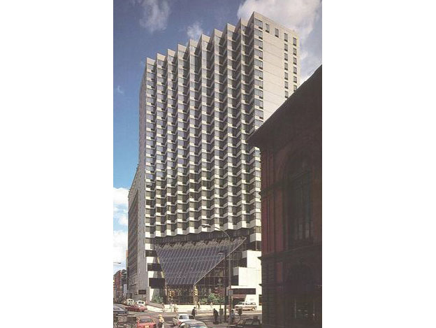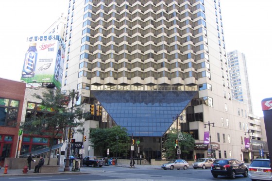 When the Bartram closed in the early 1960s, the building was dismantled to make way for an empty lot where homeless people and crackheads could congregate. According to Philaphilia, The entertainment division of the Hershey Food Company purchased the plot in 1980 and, in 1982, opened the largely unsuccessful Hershey Philadelphia Hotel. It was at this point that the current structure, with its questionable accordion aesthetic, was introduced to Broad Street. The photo below, also borrowed from Philaphilia, shows the Hershey upon its opening.