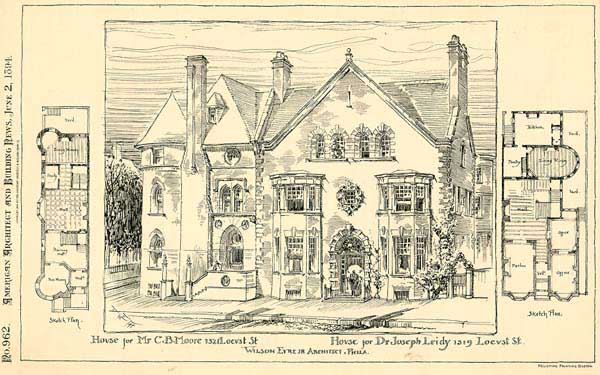 According to Philly Roots Web, the church would relocate to Broad & Montgomery by 1890.  It was at this point that the original structure was demolished and replaced with a pair of homes for two prominent Philadelphians. As the placard on the outside of one building reports, promising young architect Wilson Eyre, Jr. constructed the neighboring houses for famed archeologist Clarence B. Moore and noted paleontologist Dr. Joseph Leidy.  The houses are shown in the sketches here below, both taken from the Bryn Mawr College website.