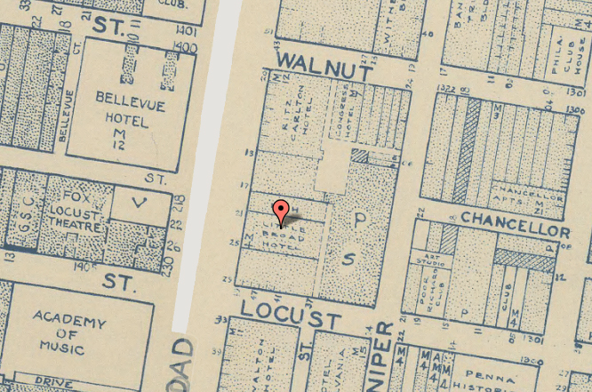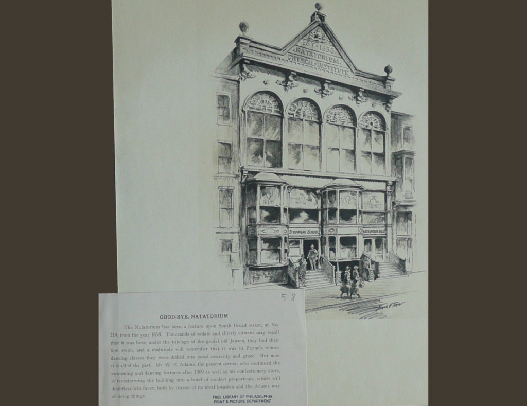 Based on the kid levitating high above the pool, we assume that there was no active lifeguard on duty. Despite the absence of proper pool safety standards, the Institute was a preferred fitness destination for the city’s well-to-do residents. Indeed, according to the Philadelphia Dance History Journal, young ladies honed their critical promenading skills in the Natatorium-housed Solomon Archer Academy for dance instruction. The building is shown here below in a 1916 photo taken from the Philadelphia Department of Records.