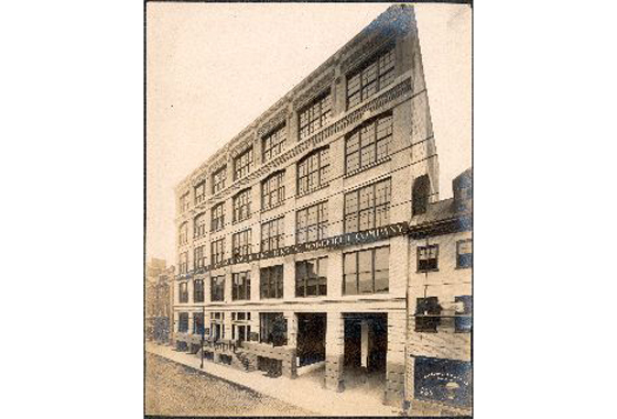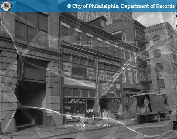 Meanwhile, back at South 5th Street, the remaining Free Quakers were preparing for a big move as well. Evidence seems to suggest that the burial ground was relocated to Audubon, PA, making way for the next phase in the plot’s history. It was in the year 1897, according to Wikipedia, that furniture business competitors Heywood Brothers and Wakefield Company merged to form the aptly named Heywood-Wakefield Company. The high-end furniture manufacturers would not only go on to achieve great popularity in the business, but today, many of their pieces are highly valued as collectibles. Their expansion would allow the Massachusetts-based company to establish facilities in Philadelphia, which took up the former cemetery plot in 1908. The photos below, taken from the Philadelphia Architects and Buildings collection, show the building sometime between 1907 and 1915.