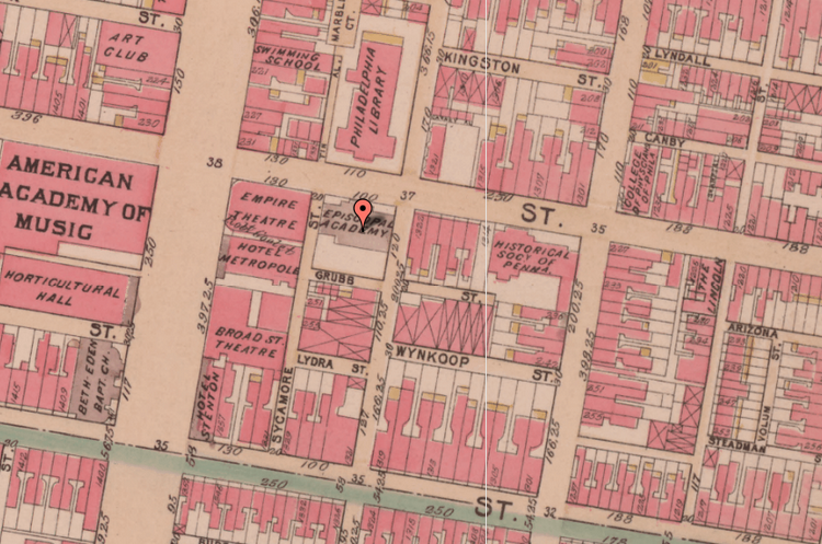 The building at 1324 Locust Street offers housing and event reception less than a block from the Avenue of the Arts. But records show that long before this Art Deco structure was erected, the address served as the Academy of the Protestant Episcopal Church. Opened in 1850, the Academy’s location is confirmed here below in a photo taken from G.W. Bromley’s 1895 Philadelphia Atlas.