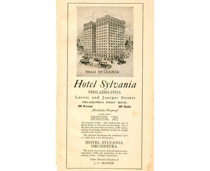 In 1921, according to Wikipedia, the Episcopal Academy moved to Lower Merion, making way for the Hotel Sylvania. Built in 1922, the Sylvania was the second largest hotel in the city at the time of its opening and it quickly became a popular destination for members of Philly’s organized crime families. Indeed, among the more colorful of its long-term guests, Philly Neighbors tells the story of boxing promoter and bathtub bootlegger Max ‘Boo Boo’ Hoff, who ran a successful hooch business out of a suite on the Sylvania’s second floor. The 1928 advertisement below is borrowed from a website called Wookmark and sports the catchy slogan “the entire environment of the Sylvania in every department fulfills the expectation of the most exacting visitor. Garages convenient.”