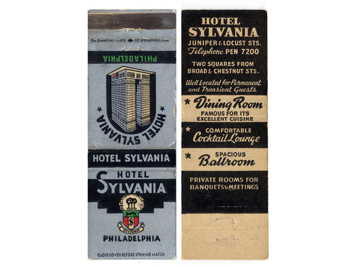The Sylvania remained popular even as the prohibition era ended, largely by virtue of its proximity to Broad Street, a point which is pronounced in all of its print advertisement materials. So is this noted on the undated matchbook shown here below. Taken from Match Story, it describes the hotel as “well located for permanent and transient guests.”
