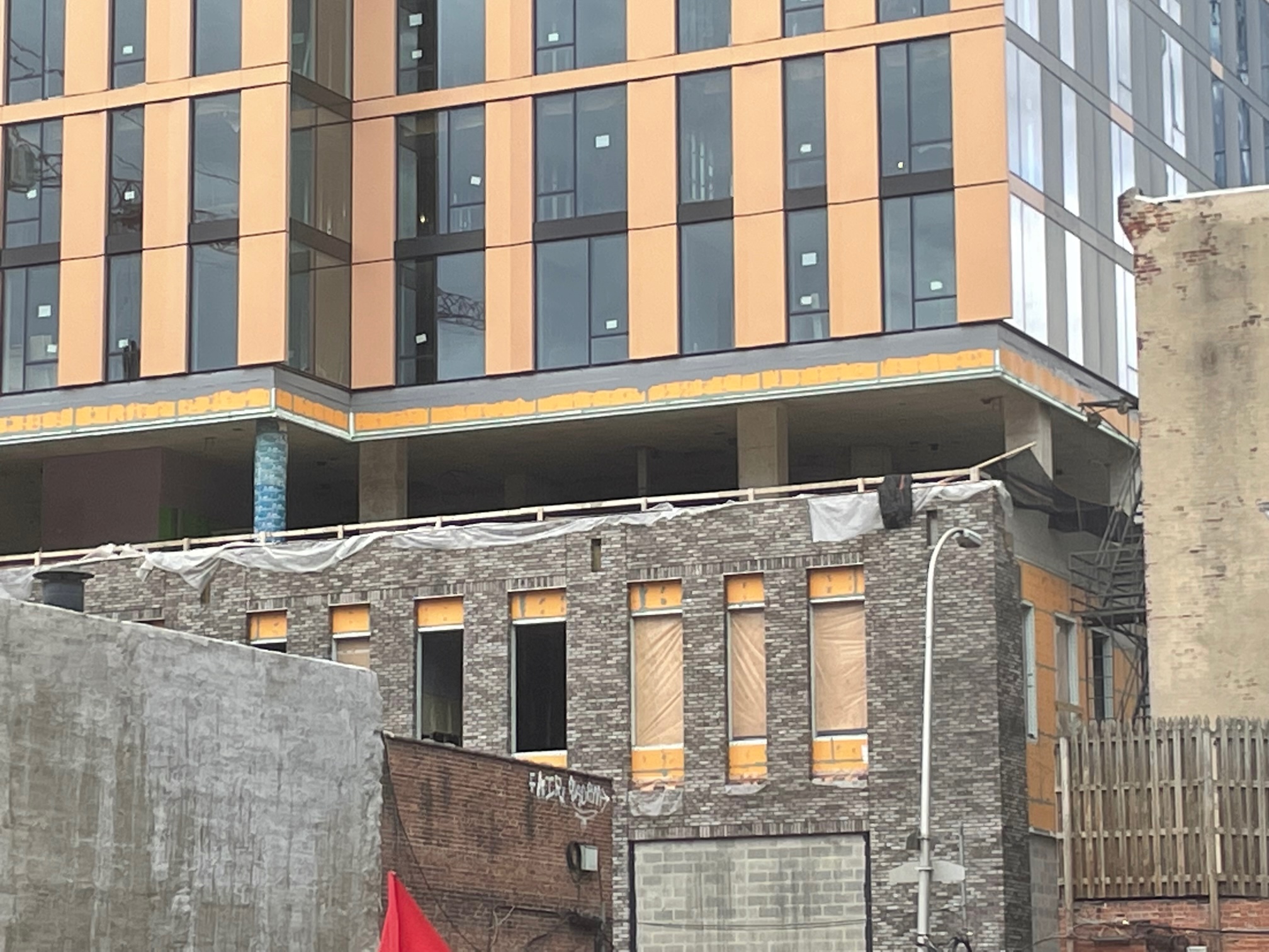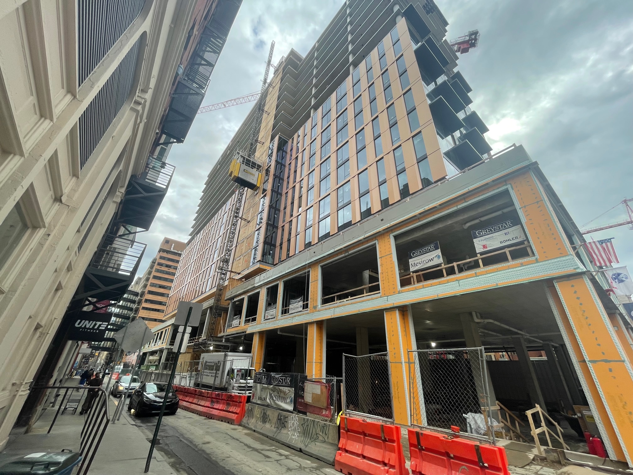 This 412-unit project will bring a contemporary addition to the area. After initial plans targeted a senior-living-in-the-city project, market rate apartments will instead fill the upper floors, while the Japanese-Peruvian culinary flair of Chotto Matte will unveil their fourth US location on the ground level, with a target opening sometime in the summer (fingers crossed). A light brick podium will contrast with the glass and orange paneling on the upper floors, creating a playful tower that stands out along the stretch of older buildings. The structure is nearly topped out, with the facade now halfway up and brick starting to go up along the southern face.