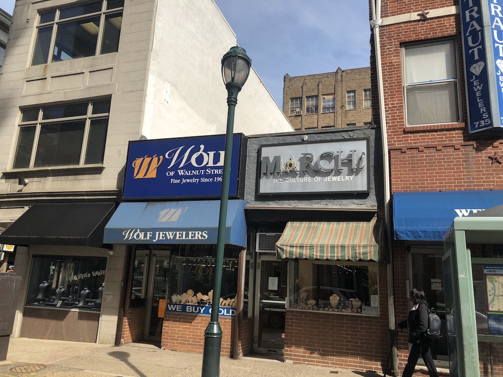 As anyone might expect, the north side of the 700 block of Walnut Street is quite historic, with buildings dating back to the early 1800s. At one point, there was handsome enough four-story building at 737 Walnut St., but it was torn down in the 1930s and replaced with a one-story commercial building in the 1940s. That building has been split by a pair of jewelry shops for decades, apropos of its location around the corner from Jewelers’ Row. While the recent demolition of a row of buildings a block up generated considerable angst, nobody is going to mourn this little building on Walnut Street. That being said, the Historical Commission has a seat at the table on any project coming to this address, as it sits on the northern end of the Society Hill Historic District. In case you’re wondering, the 700 block of Sansom is juuuust outside the district, which is why Toll Bros. was able to move forward with their development despite community opposition.