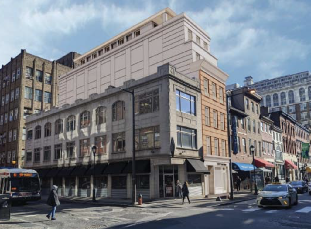 The architects came back with a new plan, including a red brick facade and setbacks above the fourth floor. This building will certainly fit in better with the context of the rest of the block. The Commission’s Architecture Committee had requested that the building fit in even more though, asking for less height and matching the cornice line and window height with the building next door to the east. So it’s possible that the design will change a little more, or perhaps it’ll stay as it’s shown in the rendering above. Either way, it’ll be a much better use for prime real estate- it’s actually amazing that there are any one-story buildings left in Center City. Surely, several developers out there are actively looking to hunt this species into extinction.