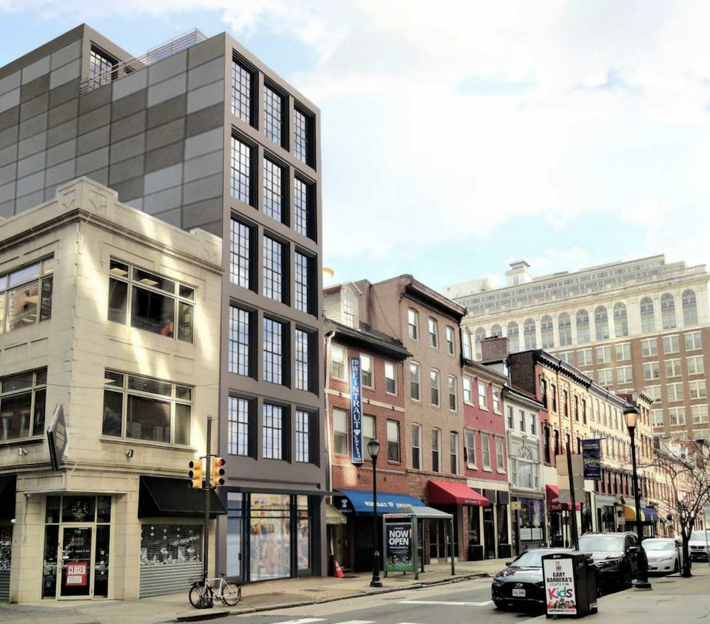 Initially, the developers came to the Historical Commission with a plan for a seven-story mixed-use building with 11 visitor accommodation rooms, featuring a design that drew from an industrial influence. The Commission didn’t like the factory style mullions, citing the fact that the block is home to some of the first row homes in Philadelphia. So they asked the SgRA Architecture folks to go back to the drawing board.