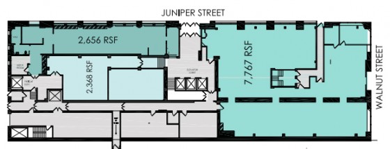 Currently, the retail space on the first floor is available for lease. According to the listing from Fameco, nearly 8,000 sqft of space are available on the corner of Walnut and Juniper Sts., and an additional 5,000 or so sqft are available on Juniper St., to the north of the front door of the building.