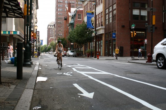 Seems like we were just wondering where the Streets Department would put the city’s two north/south bike lanes, but there’s no more guessing anymore! As of this weekend, a fresh new bike lane was painted on 13th St. And while we didn’t make it over to 10th St., you can bet that they’ve either already painted a new bike lane there, or it’s soon on its way. The new north/south bike lanes on 10th and 13th Sts. are a direct result of the success of the city’s east/west Spruce and Pine street bike lanes, and whether we get to keep them will be determined by whether the people use them. Also- it looks like the City is wasting no time in actively enforcing the new bike lanes either, as we saw a car get towed for blocking the lane at 13th and Chestnut right before snapping this photo.