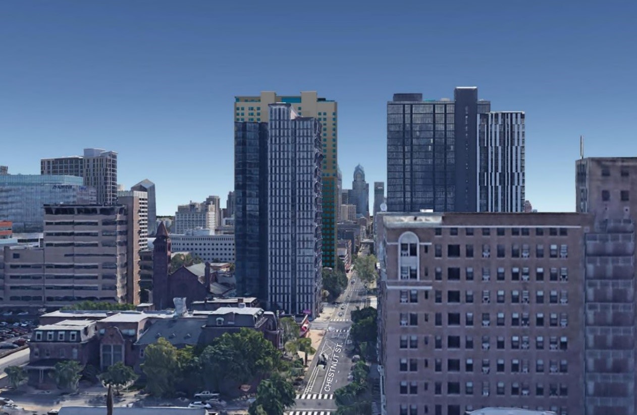 But thanks to that wonderful, wonderful Civic Design Review, we now know some details on the big plans for the site. Landmark Properties will be building The Mark at Philadelphia, a 363-unit project consisting of 236 multifamily residential units and 127 group living units (probably meaning student housing). The structure will rise over 400′ including the mechanical extension, with amenity levels on the 21st and 34th floors. Parking for 70 cars and 96 bikes is accessed from Ludlow St., keeping Chestnut St. as a purely pedestrian experience. This tower gives off contemporary vibes, with glass and blue touches adding to the visual interest as the ombre metal panels get lighter as they go up the building. Let’s check out those renderings to get a better feel for what’s in store.