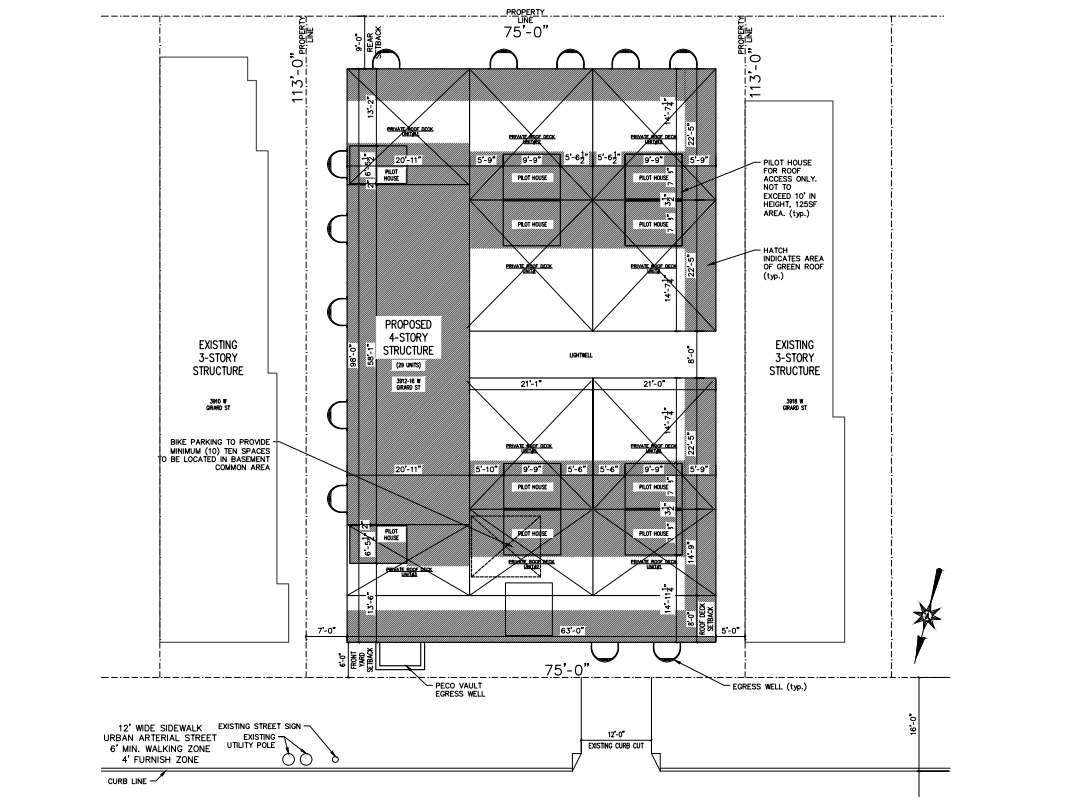Not the most inspiring, right? While light on details, a separate recently issued zoning document provides some additional info. For the property at 3912-16 W. Girard Ave., which is zoned CMX-1 (unlike the CMX-2 zoning for the other lots), a trip to the Zoning Board of Adjustments led to a variance to build a four-story building on the property, with 29 units coming from Cadre Design. Though we can’t be certain, we’d be willing to wager that the two western properties get a similar treatment, with brick, masonry and metal paneling making up the facade along Girard.