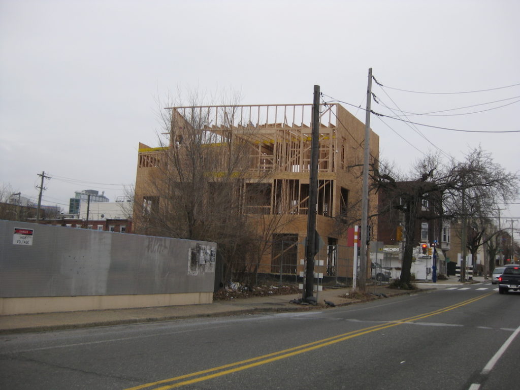This project has actually been years in the making. Two years ago, we told you about a sign on what was then a vacant lot, advertising 7,000 sqft of office space with parking. According to one of our readers, that sign had been posted since at least 2009. Back when we wrote the original post, the ZBA had approved a three story building with a real estate office over two floors, two apartments, and seven parking spaces. The project now rising is similar. The real estate office is still part of the deal, but now it's three apartments and only five parking spots. Alas.
