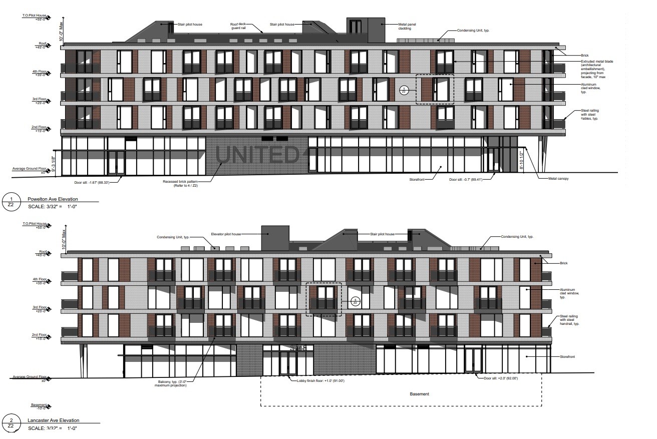 Speaking of nearby corners, there is another corner just to the south at 3748-52 Lancaster Ave., that appears to be prepping for a change. Formerly a bank, this triangular parcel has since been cleared, with plans for 40 units over ground floor commercial space, designed by Strada Architecture. While the old bank had a cool midcentury vibe, we certainly don’t mind seeing additional residential mass along a growing commercial corridor. Let’s check out what’s to come.