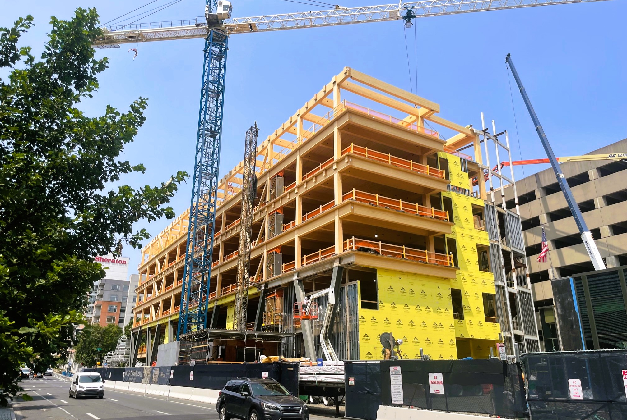 While the replacement of a surface parking lot with a gleaming new data science building is a wonderful upgrade for the property, the construction technique here has us even more excited. Designed by Lake|Flato and KSS Architects, this structure’s mass timber frame sits atop V-shaped steel along the first two floors. Those first two floors will serve academic purposes, with the upper floors focused on cross-disciplinary research. Seeing the building under construction is quite jarring, with the massive timber columns and beams creating a look that we are not used to seeing for buildings of this scale. The warmth of the wood belies its strength, as this timber is actually better suited for handling fires than the steel beams we’re more accustomed to. The building is almost topped off, with a massing that looks just like the renderings.
