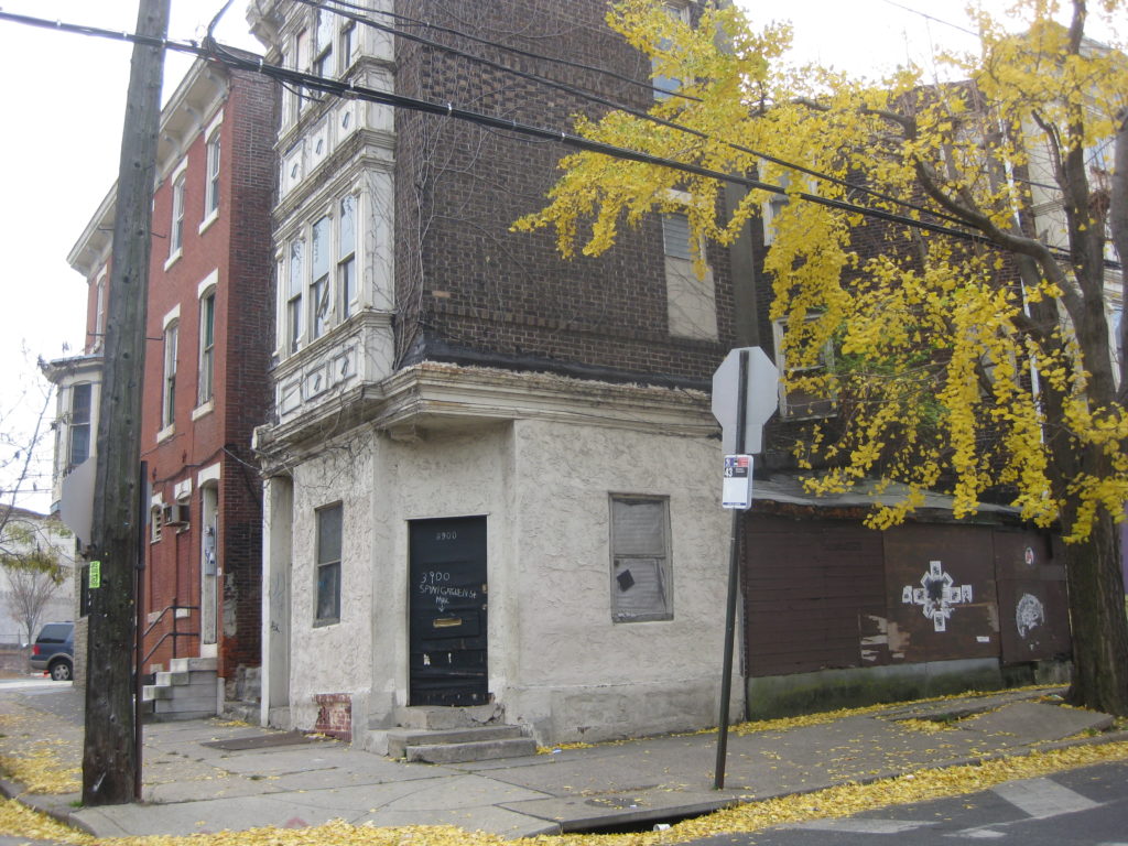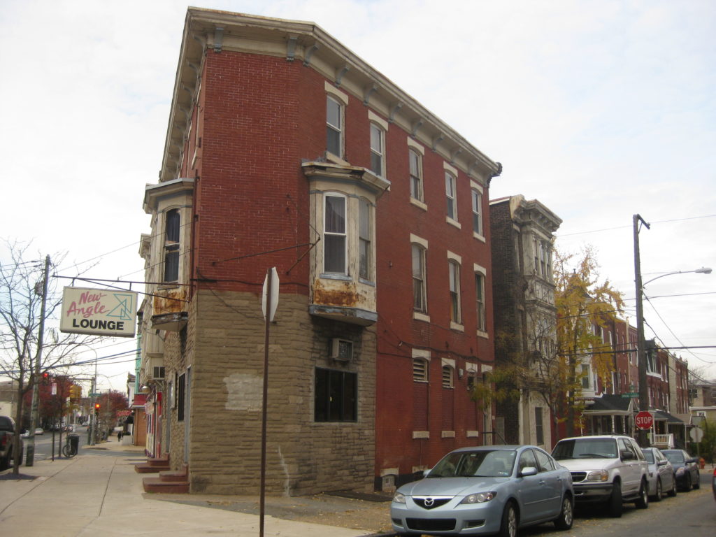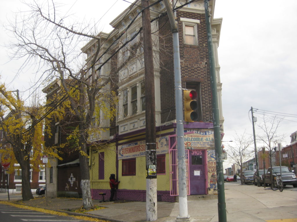 Located at 3901 Lancaster Ave.New Angle Lounge is your standard shabby corner bar. Right behind the bar, along 39th Street, is a blighted three-story building. Chalk scrawled on the front door of the place lists the address as 3900 Spring Garden St., but that address doesn’t exist according to city records. From what we can tell from city maps, the blighted building is part of 3903-05 Lancaster Ave., which includes a colorful storefront on Lancaster which contains an exterminator business and potentially vacant upper floors. All of the properties in this triangle have been owned by the same folks since at least the 1970s, and there are delinquent taxes on both that total about $15,000.