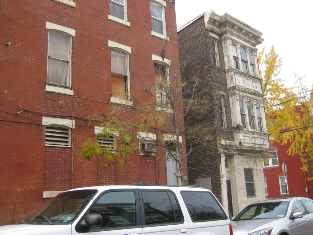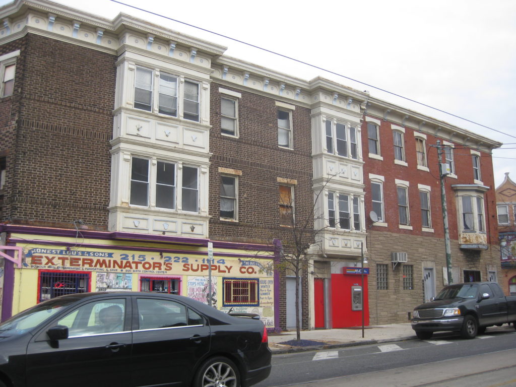 View along Lancaster Ave. shows at least one boarded up window upstairs