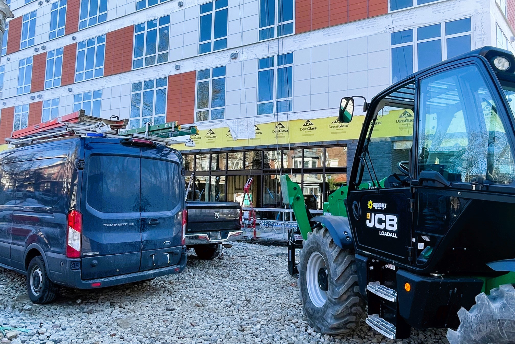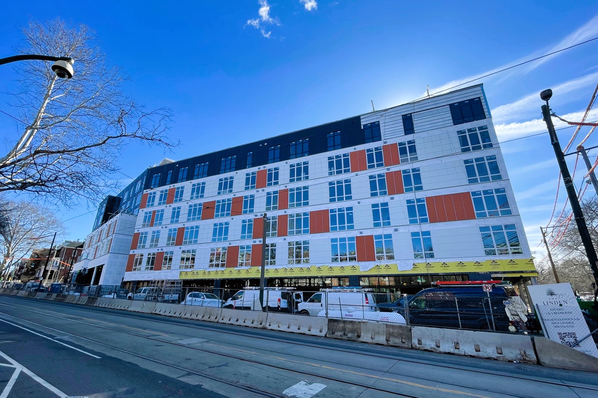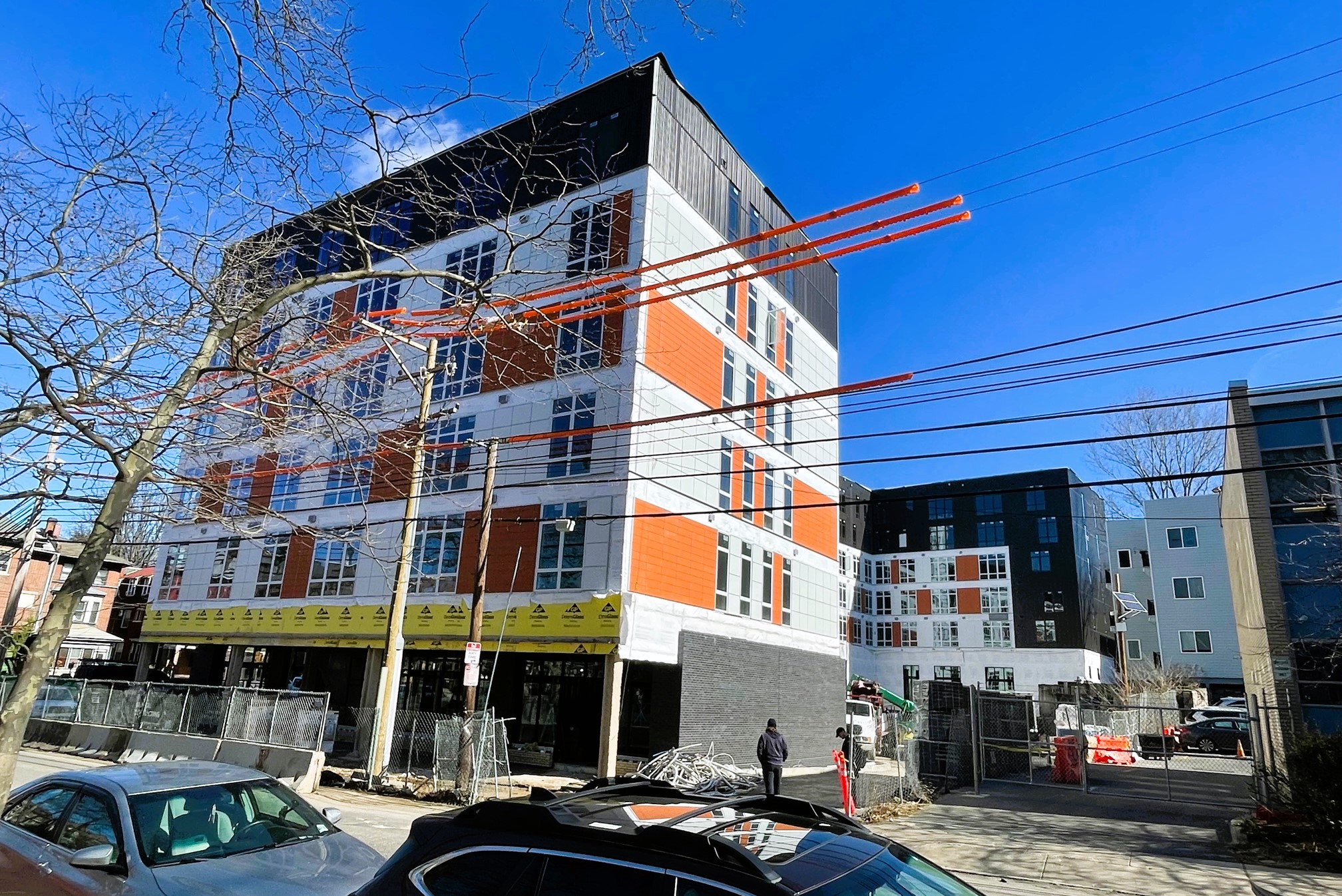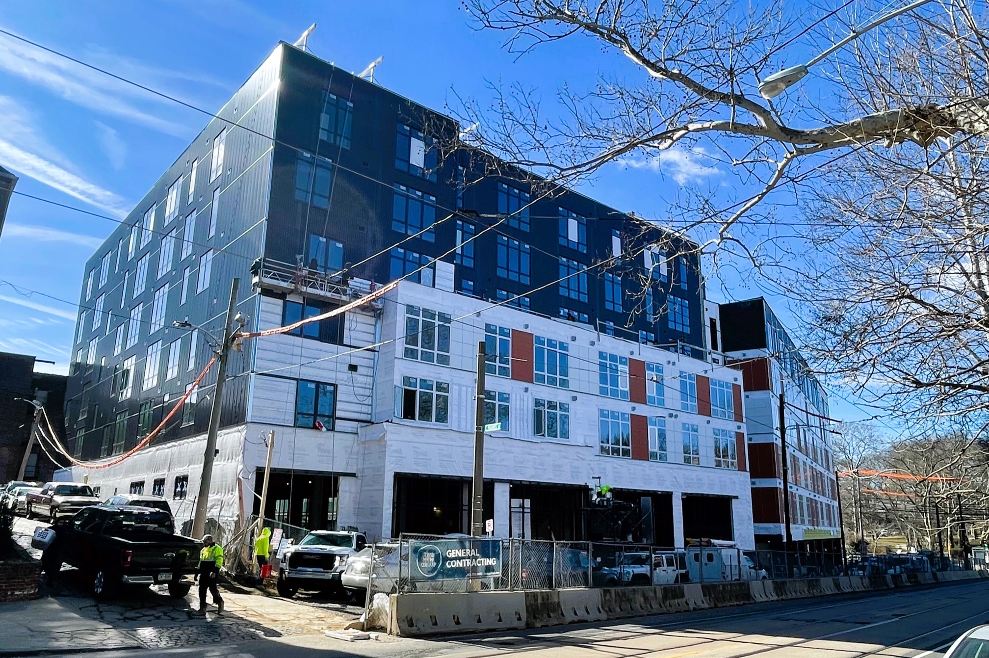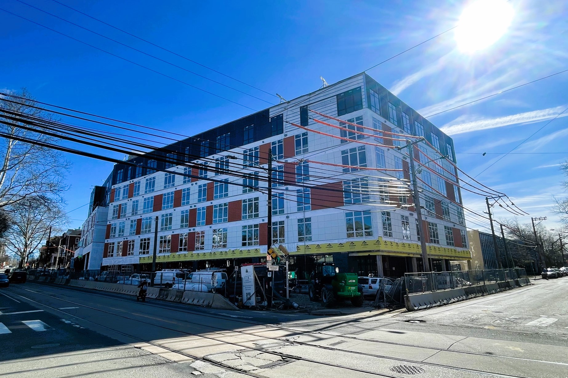 This project adds quite a new element to the corner, injecting density where there was none. We are sad to see the trees no longer there, but the presence of a huge park literally across the street softens the blow. The ground floor will also contain commercial spaces, with permits angling for a restaurant to activate the corner. Units will include studios, one- and two-bedroom offerings, providing a nice mix of options for this incredibly convenient location along the trolley line. While not complete quite yet, many of the finishes were in place, giving us a pretty clear vision of what the future holds.