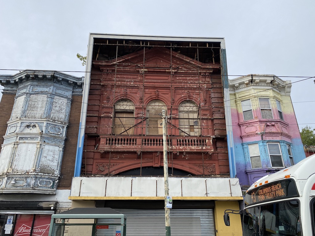 Roughly three years ago, we drew your attention to the building at 4102 Lancaster Ave., noting the discount store on the first floor and the metal cladding covering the windows on the upper floors. Nothing about the building’s appearance was especially notable, though the metal cladding’s red white and blue color scheme did give us some patriotic feels.