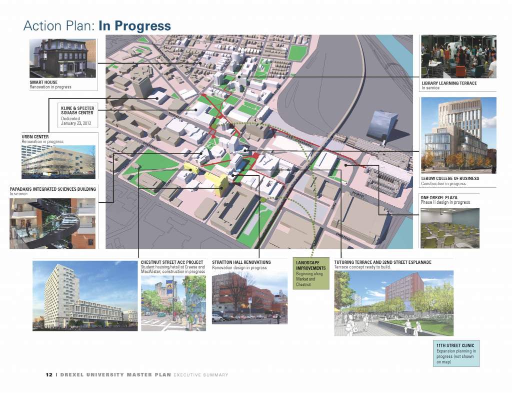 The Drexel Master Plan 2012-2017 was presented to its board of trustees last February. It applies the school’s Strategic Plan vision into a larger four principled master plan, with a scope for action: distinguish Drexel’s campus as a vibrant urban university district, bring the campus to the street, draw the community together around shared spaces, and expand its innovation community.