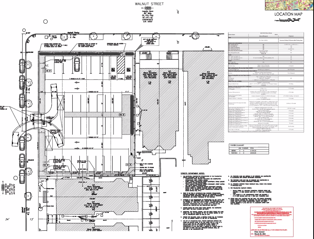 At the aforementioned ZBA hearing last week, the developers cited general economic reasons to explain their decision to put the project on temporary hold. In the meantime, Campus Apartments is looking to utilize the newly vacant land for employee parking, hence the ZBA hearing. VP of Development Jonathan Chopp noted that constructing a parking lot would include adding modest landscaping to the site. In fact the presence of a landscape buffer along Walnut Street was one factor noted in the letter of support for this variance from the Spruce Hill Community Association.