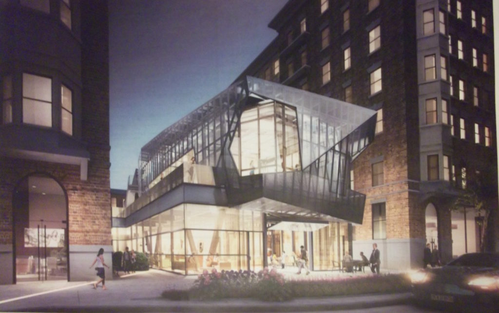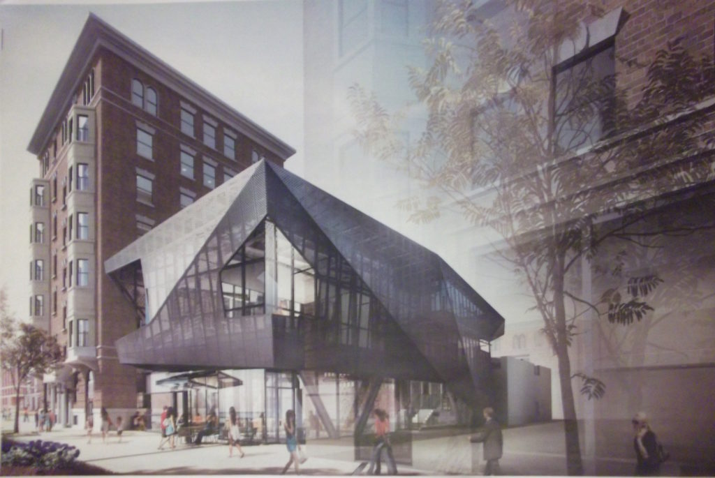 The architecture of the new building is obviously supposed to stick out as something brand new. The renderings show a spaceship-looking metal mesh which encases a glass-box interior structure. The developers said that the bottom floor of this building will be neighborhood retail and the second story will be a gym for residents. When asked why the developers wished to put a gym in this building when access to the Penn gym was guaranteed to all residents, the developer said that an in-house gym was still seen as a major amenity for prospective residents. The developer still has to get changes to this property approved though it seemed like members of the Spruce Hill Community Association were supportive. On the one hand, we're a little sad to see the courtyard of this building disappear, especially considering what it used to look like when the building was first built. Then again, it seems like Post Brothers have a great plan for the revitalization of the commercial aspects of this building, and we're excited to see how it turns out.