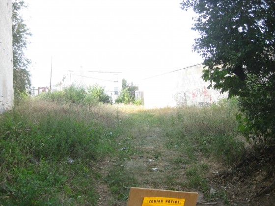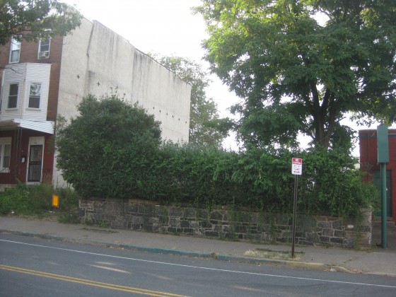 Currently, this address consists of a large vacant lot with homes to the west and an Motor Distributor (whatever that is) to the east. Notice, the lot has what must be a very old retaining wall as part of the front of the property line.