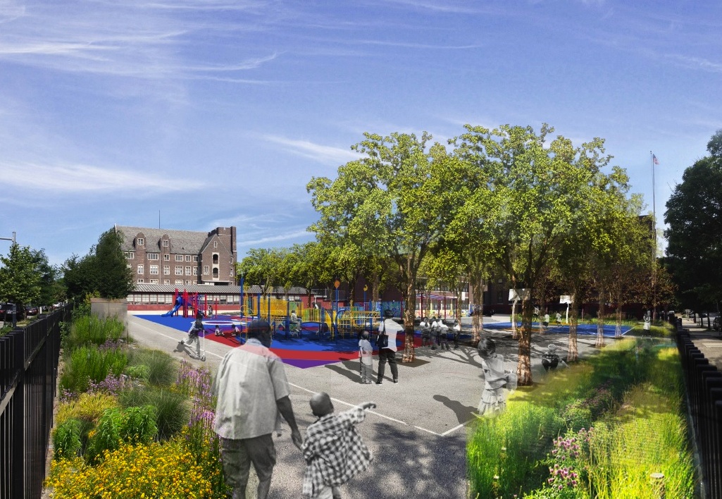 The new play surface, designed by Salt Design Studio, will sit below both the new playground and the old one. To make this possible, Greening Lea has asked for an early dispersal of $64K from the nearly $250K Stormwater Management Incentive Program grant they have in hand for their larger greening effort. The new play surface will be pourous, aiding in stormwater management on the site by reducing impervious surfaces by 4,400 sqft.