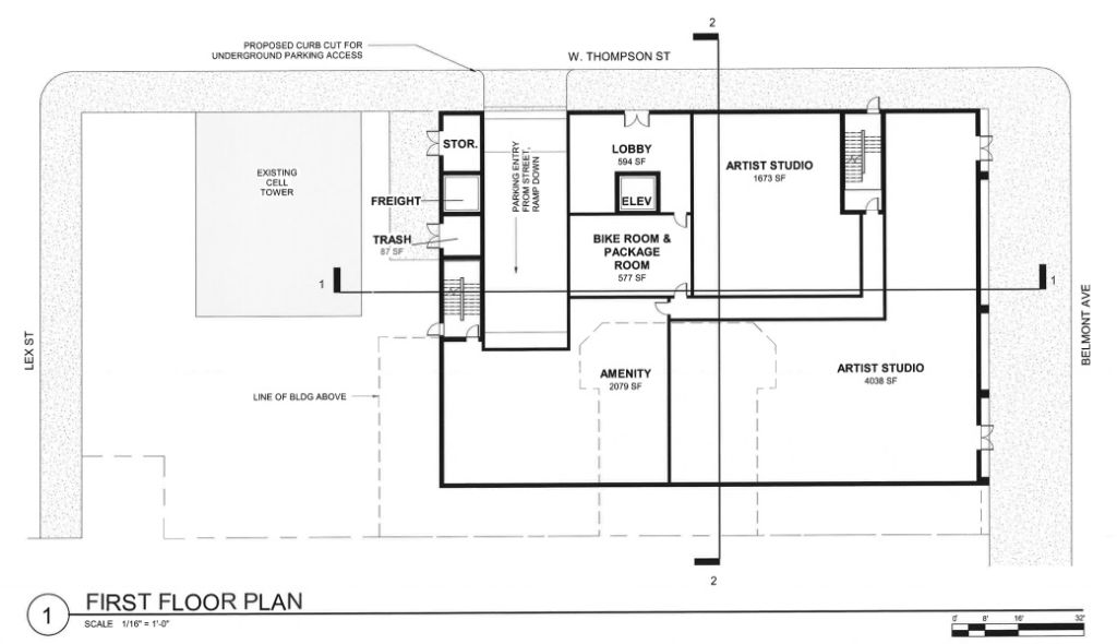 This parcel was home to John F. Scanlan Inc., but this former HVAC equipment warehouse is about to get a major makeover, per a recent submission to the Civic Design Review. Kelly Maiello Architects has designed an 84-unit building, with two ground-level artist studios facing Belmont Avenue. The C-shaped building will provide 32 below grade parking spaces and some additional open space towards the back of the lot. Let’s check out the plans below and get a little taste of what’s coming our way.