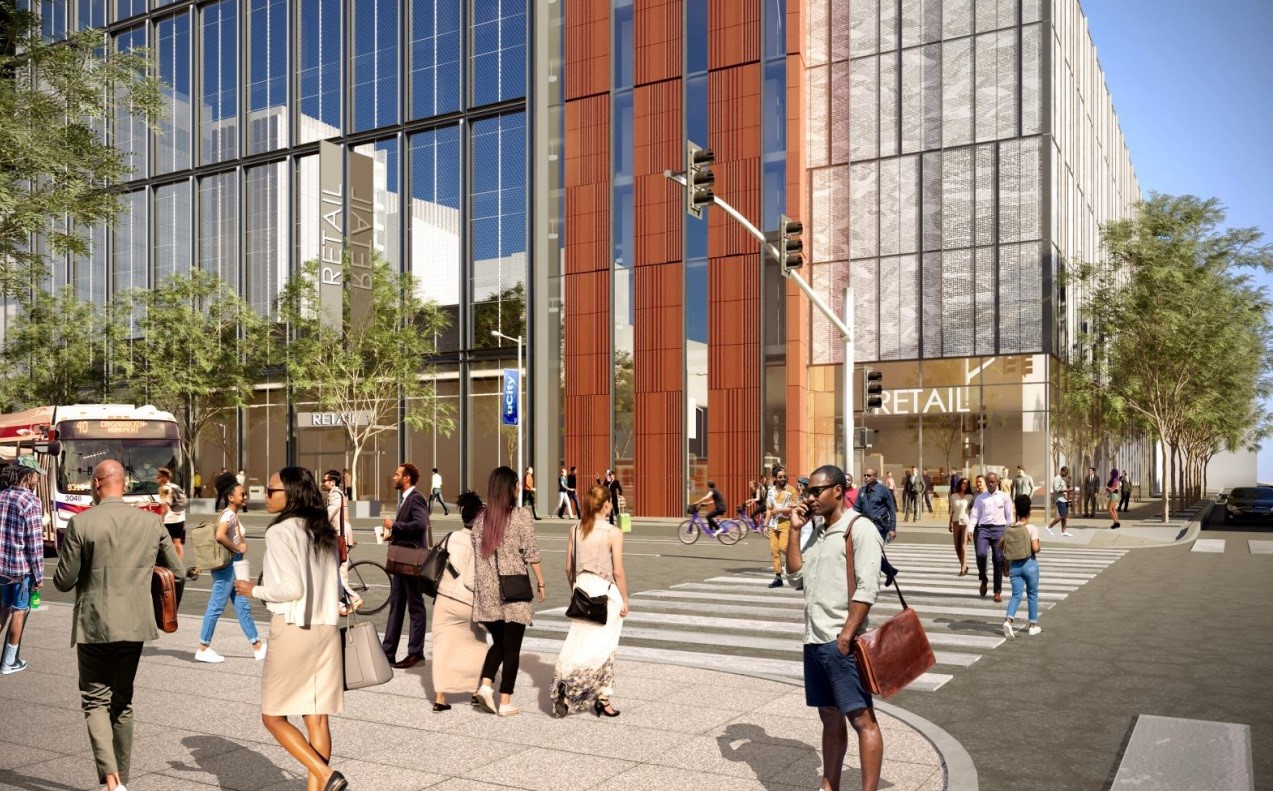 The design has been refined since we last saw renderings, with the modern appearance punctuated most obviously by the ample terracotta included on Phase I. Masonry, glazing, and perforated metal panels will help complete the look, which is pretty darn sharp for lab space over parking. The ground floor is activated by the retail and public spaces, creating a much more welcoming street presence than the aforementioned surface parking lot.