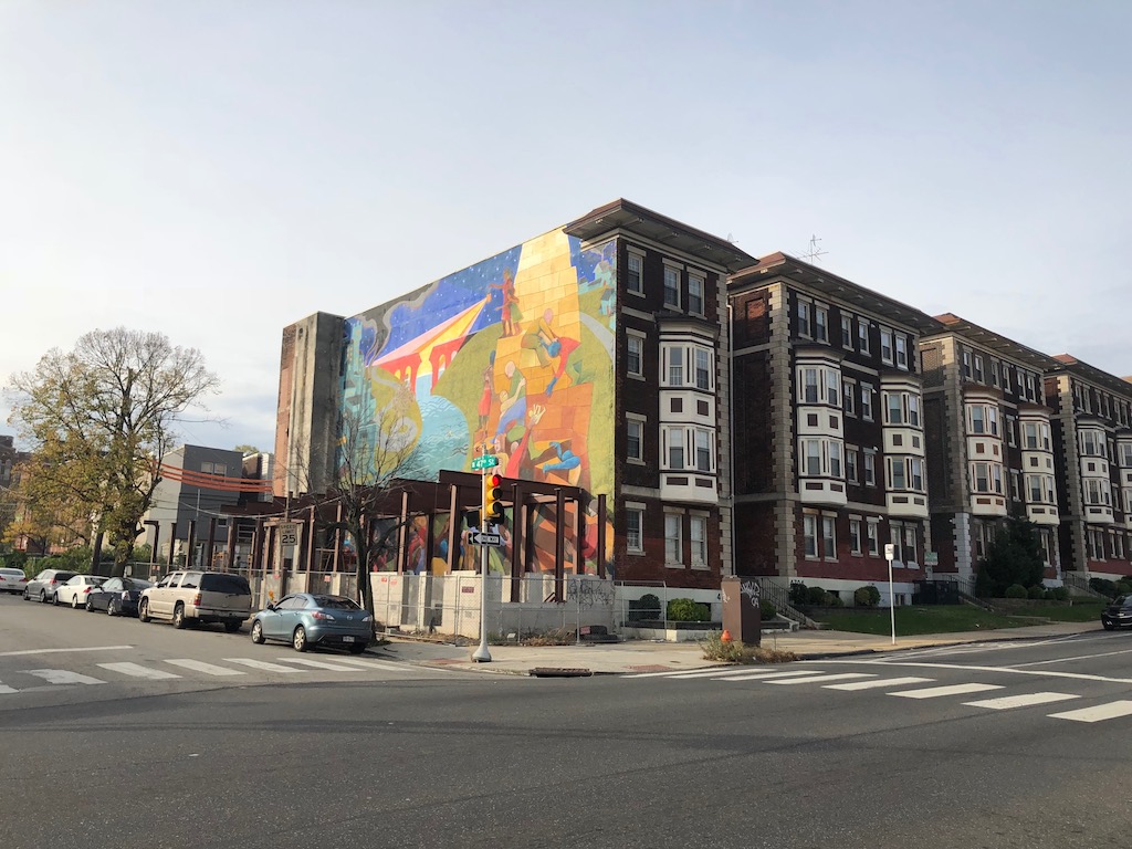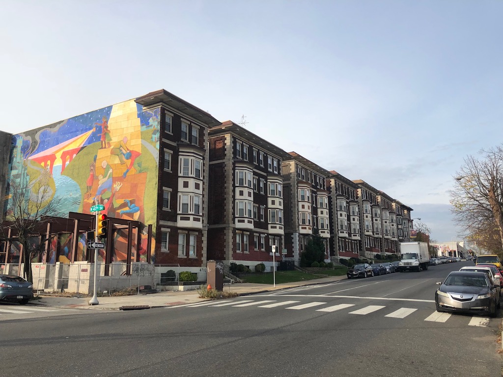 Somewhere along the line, the building at 4702 Chestnut St. lost its twin, a building that we have to think matched its neighbor like the rest of the twins on the block. The land next to 4702 Chestnut St. has been sitting vacant for quite some time, and as is often the case in these situations, the Mural Arts Program stepped in to fill the void. For roughly a decade, the eastern wall of 4702 Chestnut St. has been home to a mural called “Dialogue on Race,” by artists Parris Stancell and Davis McShane. According to a post on the ERRANT blog, the creation of the mural was tied to a community project called B.R.I.D.G.E. (Bringing Race Into Dialogue for Greater Engagement).