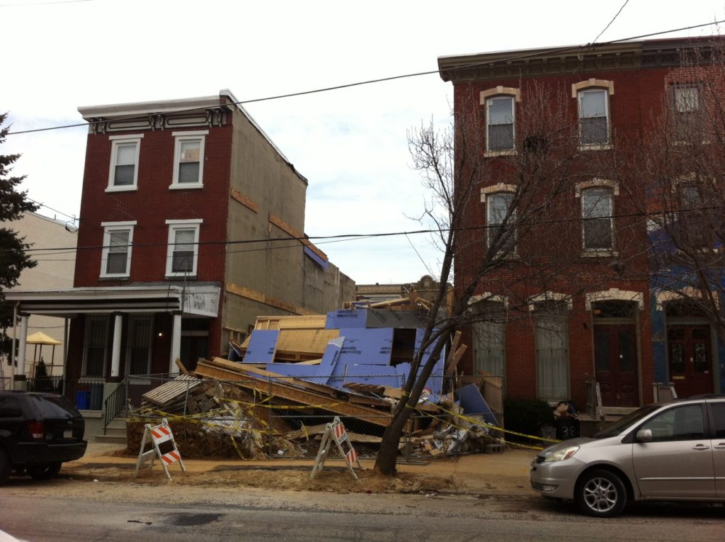 For some time, 3827 Hamilton St. was a fenced-in vacant lot. The folks who own it have had it since 2007, and own several rental properties in the area. In 2012, they decided to redevelop the property, and got a variance from the ZBA to build a three-unit building. Within the last few months, work got underway on a new structure. But a week and a half ago, the building, still being framed out, collapsed. Passing by over the weekend, we discovered a site that's still in need of significant cleanup.