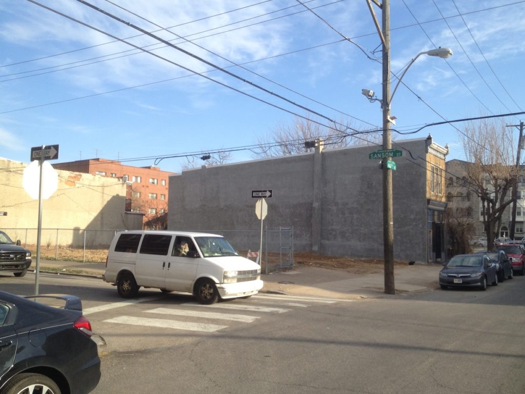 In West Philly, change has finally occurred on the southwest corner of 46th & Sansom, a parcel that has been vacant for many years. A little over a year ago, we noticed the beginnings of construction activity at this site, and mentioned plans for six quadplexes. Last winter, it looked like the project was stalled, though we were pleased to see some blighted buildings getting torn down across the street.