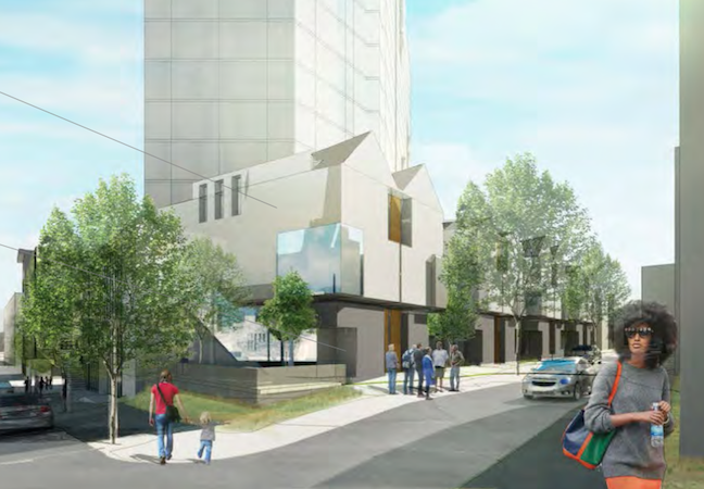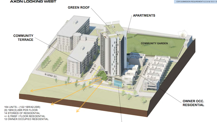 The other day, we were turned onto a Property story detailing plans for a new tower and new townhomes at this currently underused corner. The lot is owned by Drexel, but they're partnering with Radnor Property Group to build the project. These are the same developers currently building 3737 Chestnut, in case you don't recall (we didn't). According to their Civic Design Review packet, plans call for 14 stories of residential with 122 one-bedroom units and 42 two-bedroom units. The first two floors will be a combination of lobby space, a fitness center, and a childcare facility with room for up to 164 kids. The basement will contain a small parking lot. In addition, there will be twelve low-rise residential units built and sold on Summer Street, replacing some worn-looking properties and vacant lots. Design work is being done by Erdy McHenry.