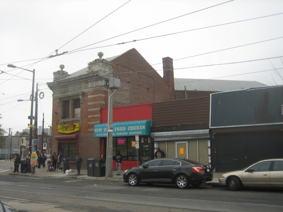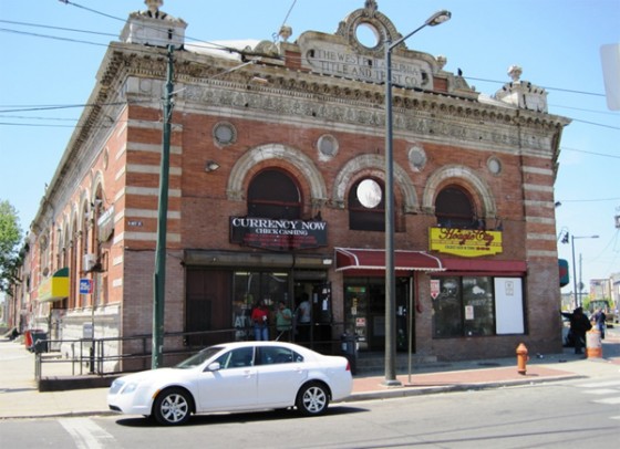 We don’t have information on what’s going into this space, but we were struck by the gorgeous building just a couple of doors away. The West Philadelphia Title and Trust Company was built in 1897 and designed by Walter Smedley, according to the Preservation Alliance. While numerous impressive and attractive details remain, the building has not been designated historic. Whether the unfortunate signage from businesses that have taken up residence in the grand structure has anything to do with that, we do not know.