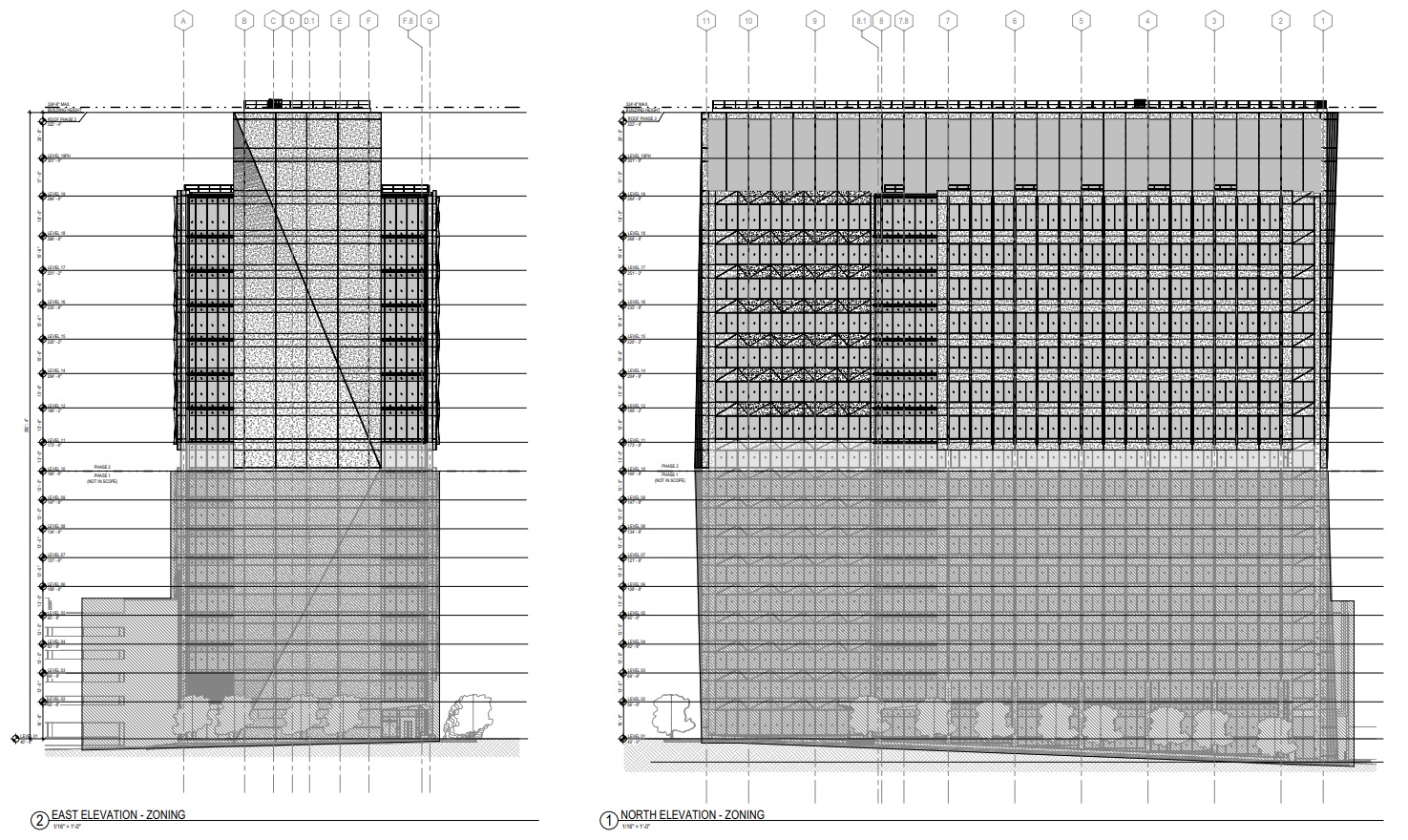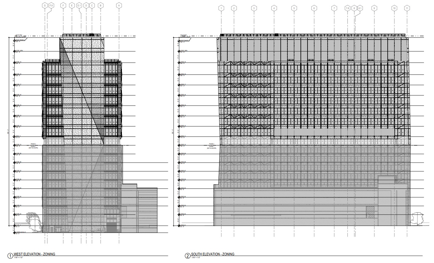 To be honest, we figured that an addition would take years to come to fruition if it happened at all, so we were delighted to learn that things are indeed pushing forward, forthwith. So, what’s to come? An additional nine stories, which calls for more office space to be topped by a couple of mechanical floors. Plans are for a seamless addition, meaning the end product is slated to look like the entire building went up at once. Another little fun tidbit is that the original height has been raised by about 20 feet for all you skyline fans. Past renderings (which look like they will be slightly adjusted) and current elevation drawings from zoning documents give us a better idea of what’s in store.