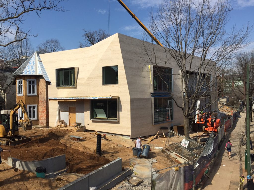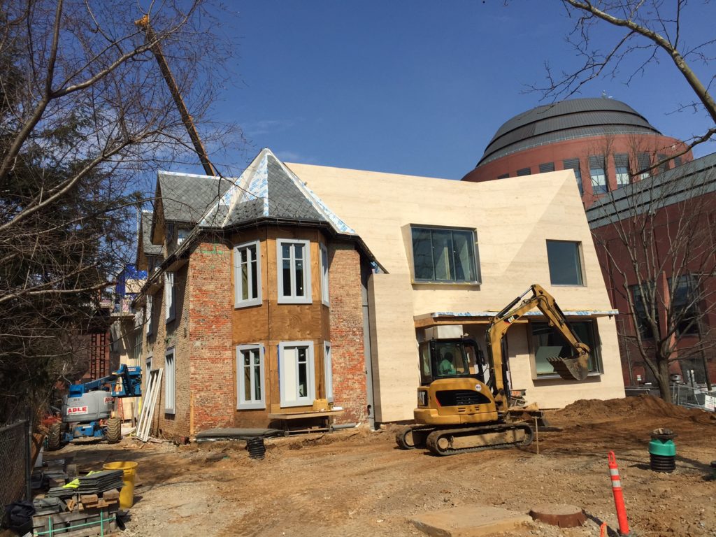 It's been almost half a year since we told you about Perry World House, a project at 3803 Locust Walk on Penn's campus, and as you can imagine there's been some considerable progress since then. A reminder, this building will be a great resource for International Relations majors and will eventually host events to increase international engagement, encourage research regarding international issues, and help to transmit that research to the rest of the world. Of more interest to this real estate blog, it's got a very unique architectural element to it. The new building will be, as Hidden City called it, an example of hybrid preservation.